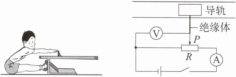 4. (2024·巴蜀中学月考)下图是某物理兴趣小组设计的简易坐位体前屈测试仪的测试示意图和简化原理图。电源电压恒为9V。测试过程中,向前推动测试仪的滑块,相当于移动滑动变阻器的滑片。当滑片P在最左端时,电压表的示数为