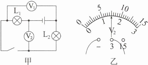 2. 如图甲所示的电路,电源由4节新干电池串联而成,开关闭合后,电压表V₂的示数如图乙所示,则灯L₁、L₂两端电压分别是