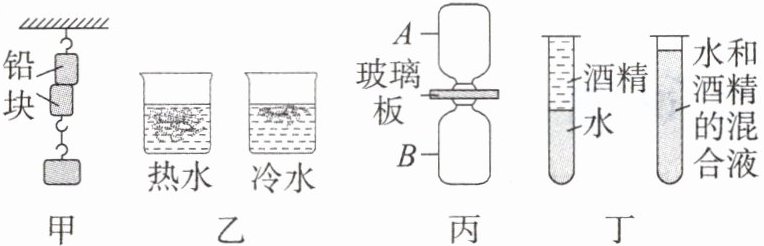 (选填“A”或“B”)瓶。(4)如图丁所示,在一端开口的玻璃管内装有一半的酒精,再沿管壁慢慢地注入带颜色的水,这时可以清楚地看见水和酒精的分界面。然后堵住管口,上下颠倒几次,使水和酒精充分混合,可以看见混合液体的体积