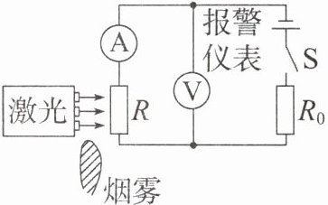 典例2 (2025·重庆八中月考)为创建无烟校园,八中物理社团设计了一种简易烟雾报警控制器,如图所示。电路中$R_{0}$为定值电阻,R为光敏电阻,其阻值随光照强度的增大而减小。当烟雾浓度增大到一定程度,电压表的指针偏转到某区域时会触发报警系统。下列说法正确的是 (