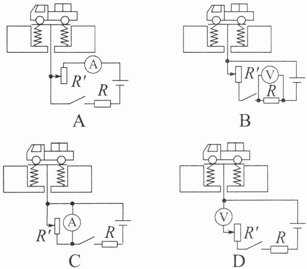 1. 地磅工作时,重物越重,电表的示数就越大。下列四幅电路图中,$R'$是滑动变阻器,R是定值电阻,其中符合地磅工作原理的是 (