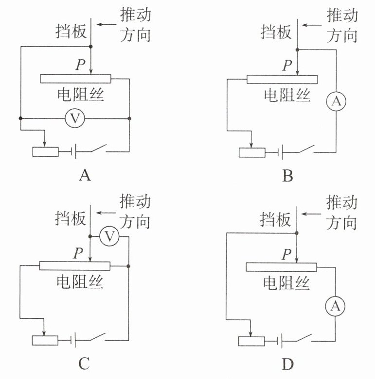 8. (2024·巴蜀中学期中改编)如图所示,坐位体前屈是常见的体育项目。学校物理兴趣小组的同学对坐位体前屈装置进行了改进,通过电表示数变化知道成绩情况。当连续推动挡板,使挡板移动相同距离时,电表刻度变化也相同的电路是 (