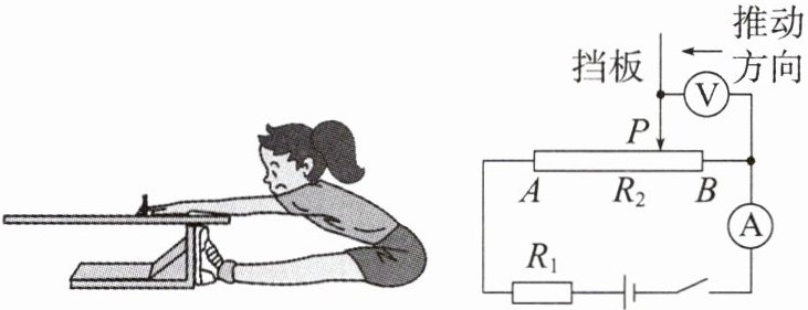 典例3 (2025·长寿中学月考)小林自制了一个坐位体前屈项目测试仪,原理如图所示,电源电压恒为10V,电阻丝$R_{2}$粗细均匀,总长度为30cm,$R_{1}=50Ω$。闭合开关,挡板P在B端时,坐位体前屈成绩为0cm,电流表示数为0.05A;挡板P在A端时,坐位体前屈成绩为30cm。下列说法正确的是(