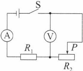典例6 在如图所示的电路中,电源电压保持不变。开关S闭合后,滑片P在滑动变阻器$R_{2}$的某两点之间移动的过程中,电流表的示数变化范围是1~2A,电压表的示数变化范围是4~8V。定值电阻$R_{1}=$