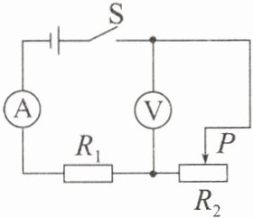 典例6 在如图所示的电路中,电源电压保持不变。开关S闭合后,滑片P在滑动变阻器$R_{2}$的某两点之间移动的过程中,电流表的示数变化范围是1~2A,电压表的示数变化范围是4~8V。定值电阻$R_{1}=$
