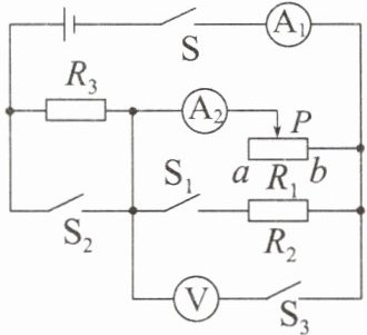 V。当闭合开关$S_{1}$、$S_{3}$,断开$S_{2}$时,在保障各电路元件安全的前提下,移动滑动变阻器的滑片,电流表$A_{1}$的示数范围为0.9~2.6