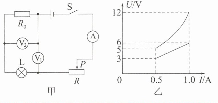 变式如图甲所示,滑动变阻器标有“20Ω 2A”的字样,闭合开关S,滑动变阻器R的滑片P从最右端滑至某一位置时,小灯泡正常发光。两电压表的示数与电流表的示数的关系图像如图乙所示。定值电阻$R_{0}$的阻值为