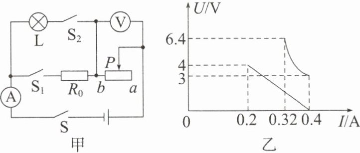7. (2025·西大附中月考)如图甲所示的电路,电源电压不变,电流表的量程为0~0.6A,电压表的量程为0~15V,小灯泡的参数模糊不清,第一次只闭合开关$S$、$S_{1}$,保证电路的安全,将滑动变阻器的滑片P在最大范围内移动;第二次只闭合开关$S$、$S_{2}$,保证电路的安全,将滑动变阻器的滑片P在最大范围内移动。图乙是根据这两次操作绘制的电压表与电流表的关系图像。下列选项错误的是(