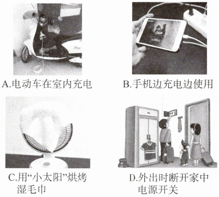 如图所示,有居民将电线插座从窗口悬挂至室外,给电动车充电。这种"飞线"充电方式存在安全隐患:①悬挂于室外的电线与窗台、外墙等摩擦,会导致绝缘皮破损,若人体接触