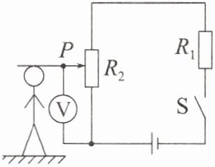 8. 初三实验小组的同学决定设计一个如图所示的简易身高测量仪,他们的设想是用滑片在绷直的电阻丝上移动代替滑动变阻器,将电压表改装成身高显示仪,且测量仪测量身高的范围能达到最大,测量精确度最高。已知电源电压(恒为12V)、电压表(量程0~3V)、长80cm的均匀电阻丝$R_2$(0.5Ω/cm)。下列说法正确的是 (
