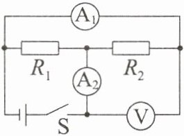 7. 如图所示,电源电压不变,电阻$R_2 = 4Ω$,闭合开关,小明在实验过程中仅记录了三只电表的示数,分别为1、4、5,但漏记了单位,则电源电压为