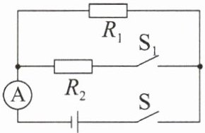 9. 如图所示的电路中,电源电压保持不变。只闭合开关$ \text{S} $,电流表的示数为$ 0.2 \text{A} $,再闭合开关$ \text{S}_{1} $,电流表的示数变化了$ 0.3 \text{A} $。那么闭合开关$ \text{S} $、$ \text{S}_{1} $后,在相同的时间内,电流通过电阻$ R_{1} $、$ R_{2} $所做的功之比是(