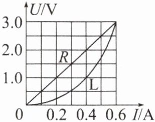 13. 定值电阻$ R $和灯泡$ \text{L} $的$ U - I $图像如图所示,将该定值电阻$ R $和灯泡$ \text{L} $串联接入电路中,如果通过灯泡$ \text{L} $的电流为$ 0.4 \text{A} $,则通电$ 5 \text{min} $电阻$ R $和灯泡$ \text{L} $消耗的总电能为______