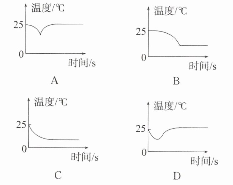 14.教室内的气温为25℃,小江同学在温度计的玻璃泡上涂抹少量与室温相同的酒精。下图中能正确反映温度计示数随时间变化的图像的是 (