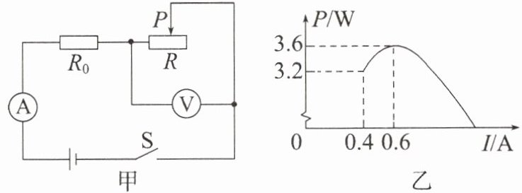 典例2 (2024·江津区期中)如图甲所示的电路中,电源电压保持不变,$R_{0}$为定值电阻,R为滑动变阻器。闭合开关S,移动滑动变阻器的滑片P,滑动变阻器消耗的电功率与电流关系的图像如图乙所示。下列分析正确的是(
