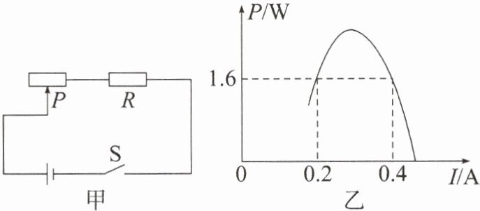 2. 如图甲所示,电源电压不变,R为定值电阻,闭合开关S,调节滑动变阻器的滑片P,滑动变阻器消耗的电功率随电流变化的关系图像如图乙所示,则电阻R的阻值为
