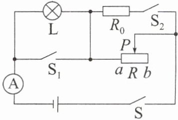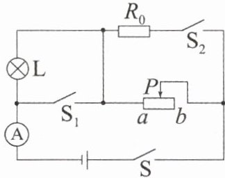 4. 如图所示,电源电压保持不变,小灯泡L标有“8V 4W”的字样,不考虑灯丝电阻的变化,滑动变阻器R标有“48Ω 1A”的字样,$R_{0}$的阻值为20Ω,电流表的量程为0~3A。当开关S闭合,开关$S_{1}$、$S_{2}$断开,滑片P移至中点时,小灯泡L恰好正常发光,则电源电压为