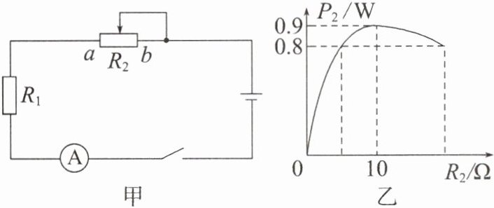 3. 如图甲所示,电源电压恒定不变,$R_{1}$为定值电阻。闭合开关,滑动变阻器$R_{2}$的功率$P_{2}$与其接入电路的阻值$R_{2}$的关系图像如图乙所示,则电阻$R_{1}$的阻值为