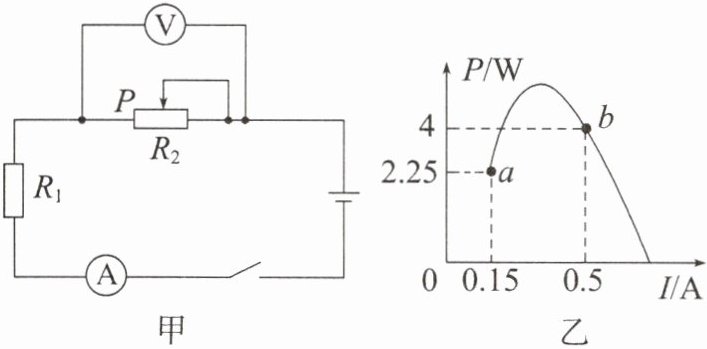4. 如图甲所示,$R_{1}$为定值电阻,$R_{2}$为滑动变阻器。若滑动变阻器的滑片$P$从最右端移至最左端的过程中,滑动变阻器$R_{2}$消耗的电功率随电流变化的关系图像如图乙所示,其中$a$点是滑片$P$置于最右端时的数据,$b$点是滑片$P$移至某位置时的数据,则滑片$P$在最右端时,电压表的示数为