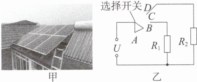 典例1 (2024·外国语学校三模)如图甲所示,为响应国家“绿色新能源、低碳环保”的号召,某地区利用当地丰富的太阳能资源进行光伏发电,供生产、生活使用。小明家将太阳能转化的电能储存到电源中,给电水壶和电暖器供电,简化电路如图乙所示。$R_{1}$和$R_{2}$是阻值恒定的发热电阻,电水壶的加热电阻$R_{1}$标有“220 V 484 W”字样,电暖器的加热电阻$R_{2}$标有“220 V 2 420 W”字样。已知太阳能照射到电池板的辐射功率为500 J/(s·m²)(即1 s内辐射在1 m²太阳能电池板上的太阳能为500 J),太阳能电池板将太阳能直接转化为电能的效率为20%。