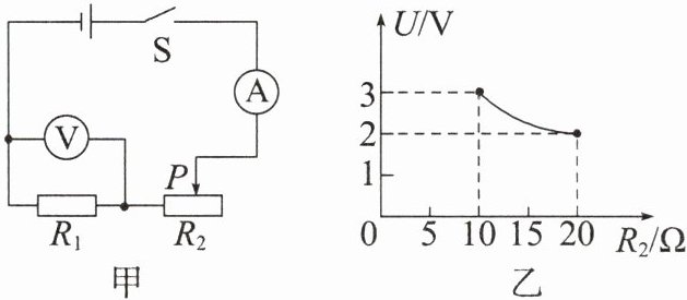 8. (2024·江苏淮安中考)如图甲所示,电源电压保持不变,$R_{1}$为定值电阻,滑动变阻器$R_{2}$的最大阻值为20Ω。电压表的量程为0~3V,电流表的量程为0~0.6A。在保证电路各元件安全的前提下,电压表的示数随滑动变阻器$R_{2}$阻值变化的关系图像如图乙所示。下列说法中正确的是 (