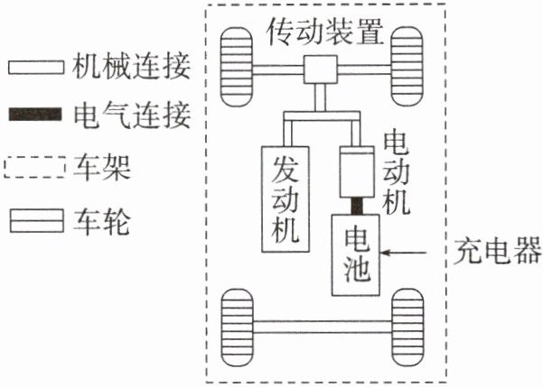 2. 插电式混动汽车是一种常见的新能源汽车,其驱动原理如图所示,行驶动力可由电动机或发动机单独提供,也可以由二者同时提供。可实现最高发动机效率46%,最高百千米亏电油耗3L和最长综合续航2100km。