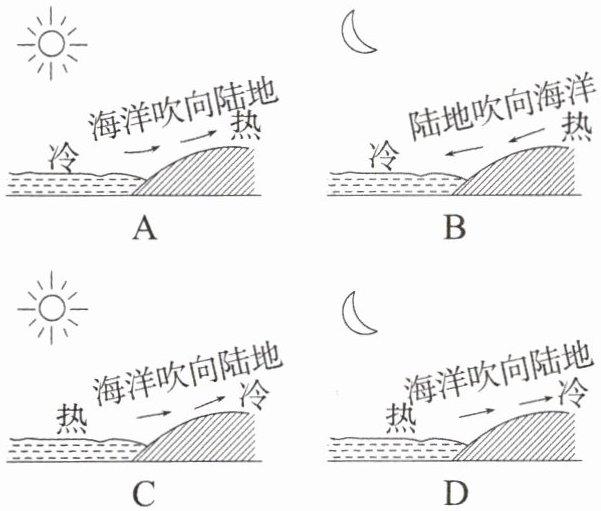 2. (跨学科实践)学习了比热容的知识后,某物理课外兴趣小组绘制了如图所示的海陆风成因及流动情况示意图,其中正确的是 (