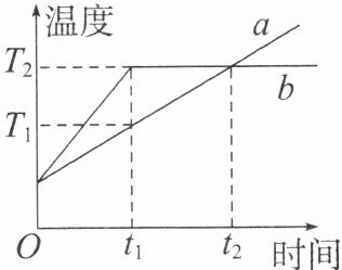 (选填“大于”或“小于”)物质b的比热容;在$t_{1}\sim t_{2}$时间内,物质b的内能增加