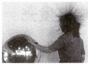 10. 如图所示的起电机叫范德格拉夫起电机,启动起电机后,金属圆球上将会带上密集的静电,为使图中女孩的头发飘扬起来,她站立的位置上____