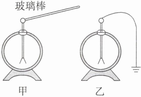 7. (2024·重庆八中期中)如图甲所示,用与丝绸摩擦过的玻璃棒接触带电的验电器的金属球,发现验电器的金属箔先闭合再张开。取走玻璃棒后再用一根导线将此验电器的金属球与大地相连,如图乙所示。下列说法正确的是 (
