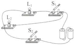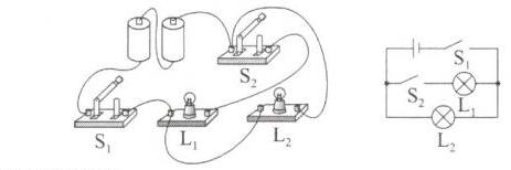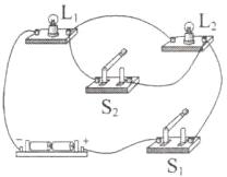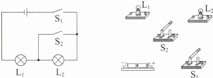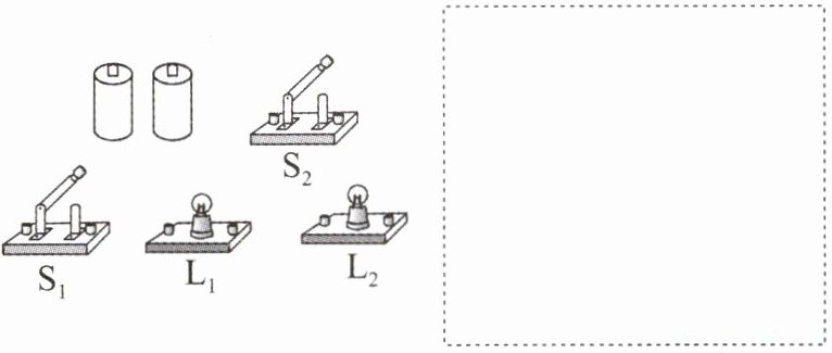 14. 请用笔画线代替导线在图中完成电路的连接(导线不得交叉),并按连接好的实物图在右边虚线框中画出电路图。要求:当只闭合开关$S_{1}$时,灯泡$L_{2}$发光;当闭合开关$S_{1}$、$S_{2}$时,灯泡$L_{1}$、$L_{2}$均发光;当只闭合开关$S_{2}$时,灯泡$L_{1}$、$L_{2}$均不发光。