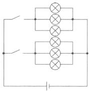 15. (一本原创)小明所在班级的教室里的天花板上有6盏日光灯,由两个开关分别控制3盏灯,根据平时在教室里看到的现象,在虚线框中画出这6盏灯连接的电路图,其中电源可用“$+-$”符号表示。