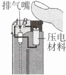 10. (2025·求精中学月考)下图为气体打火机中的点火装置——压电点火器。当按下打火按钮时,按钮下压压电材料使 A、B 两端分别出现“正”“负”电荷,电荷通过与压电材料相连的导线,在打火机的排气嘴处放电,从而点燃燃气。放电时,电流方向是______