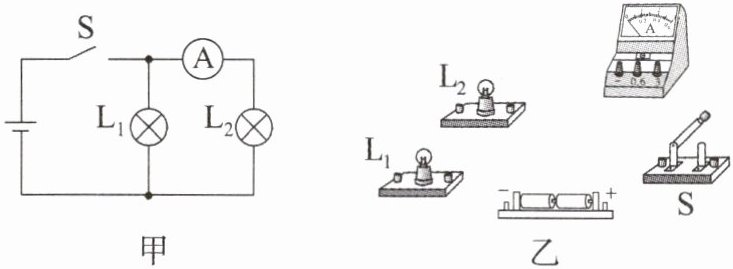 15. (2025·育才中学开学考试改编)如图甲所示,通过灯泡 L₁、L₂ 的电流分别为 1 A 和 0.5 A,请根据电路图在图乙中用笔画线代替导线连接实物。(电表选择合适的量程,导线不能交叉)