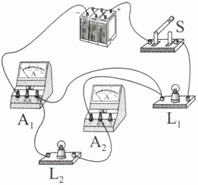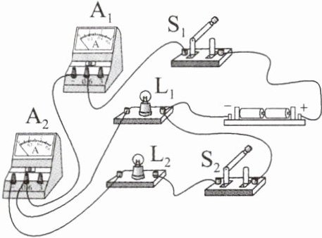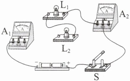 变式(2025·重庆一中月考)如图所示,请添加两根导线,使两只灯泡连成并联电路,电流表 A₁ 测量干路电流(选用大量程),电流表 A₂ 测量通过灯泡 L₁ 的电流,开关 S 控制所有用电器。