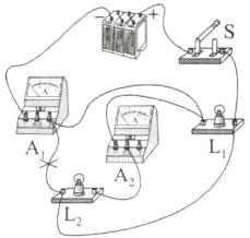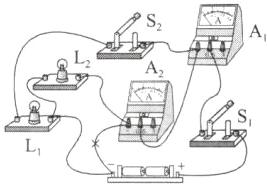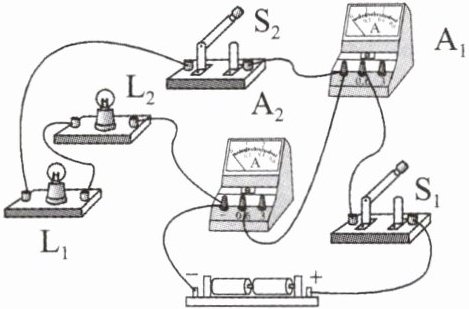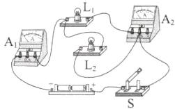 D. 同时闭合开关 S₁、S₂,电流表 A₁ 测通过灯泡 L₁ 的电流,电流表 A₂ 测通过灯泡 L₂ 的电流