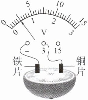 8. 如图所示,把铜片、铁片插入柠檬中,制成一个水果电池,用电压表测量它两端的电压。下列说法正确的是 (