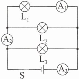 7. 如图所示,电流表$A_{1}$的示数为0.18A,电流表$A_{2}$的示数为0.32A,通过灯泡$L_{3}$的电流为0.15A,则电流表$A_{3}$的示数为