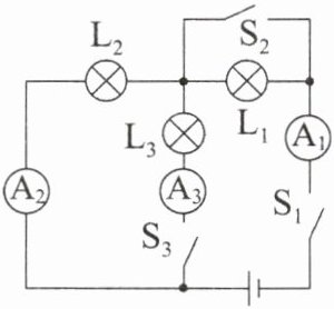 (2)若闭合开关$S_{1}$、$S_{2}$、$S_{3}$,电流表$A_{1}$的示数为1.5A,电流表$A_{2}$的示数为0.6A,则电流表$A_{3}$的示数为