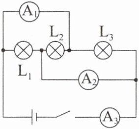 14. 如图所示,闭合开关后,若电流表$A_{1}$、$A_{3}$的示数分别是0.41A、0.53A,则通过灯泡$L_{2}$和$L_{3}$的电流之和是