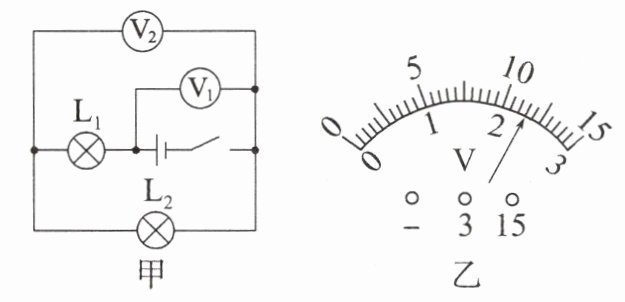 5. (2025·重庆一中月考改编)如图甲所示的电路中,开关闭合后,两个电压表指针偏转均如图乙所示,则灯泡$L_{1}$和$L_{2}$两端的电压分别为(