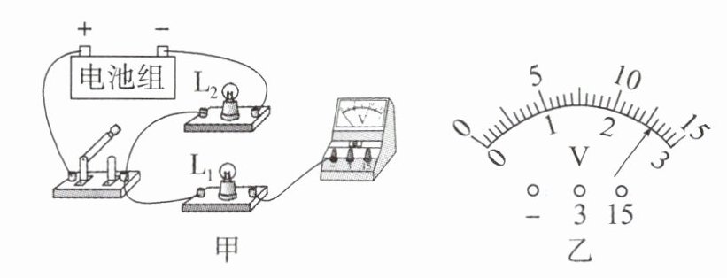 (2)请用笔画线代替导线,在图甲中把电路连接完整,要求电压表测小灯泡$L_{1}$两端的电压。(电压表负接线柱接$L_{1}$左端,$3V$接线柱接$L_{1}$右端)