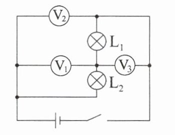 电压表$V_{2}$测量电源电压,电压表$V_{1}$测量$L_{2}$两端电压,电压表$V_{3}$测量$L_{1}$两端电压。