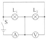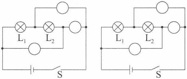 4. 请在下图的“○”中填上电压表或电流表的符号,使开关闭合后,灯L₁和L₂都能工作,画出可能的结果。