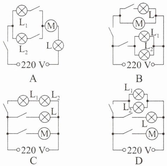 4. 如图所示,小丽家浴室的浴霸由一只照明灯L、两只取暖灯L₁和L₂以及一个排风扇M组成,它们正常工作时的电压均为220V。其中照明灯和排风扇都可以单独工作,两只取暖灯总是同时工作。在下列四个电路图中,符合上述要求的是(