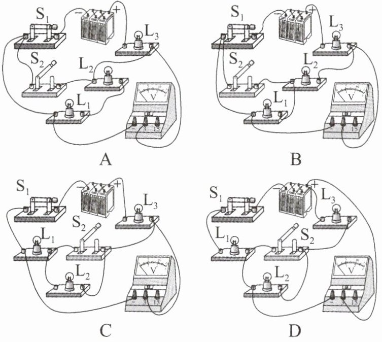 9. 在下列电路中,当开关S₂闭合时,电压表测灯L₂两端的电压的是(