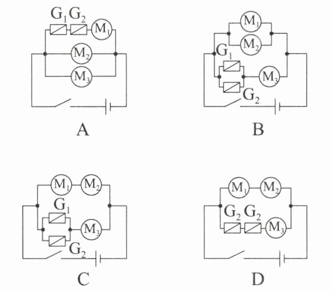 8. (新科技)如图所示,扫地机器人是一种智能化的清洁工具。它内部电路主要由驱动和吸尘两部分组成,闭合开关,与吸尘部分互不影响的毛刷电机M₁和吸尘电机M₂,以及为驱动提供动力的步动电机M₃同时工作。遇到障碍物时,红外感应器G₁或触碰感应器G₂就会发出指令,步动电机实现自动避障。关于扫地机器人的模拟电路图中正确的是(