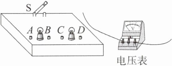 7. 如图所示的电板上有两个可以旋下的小灯泡,在板面上只露出4个接线柱A、B、C、D和一个开关S,另有一只接有导线的电压表,老师让同学判断两个小灯泡的连接方式,以下方案中最简单可行的是(