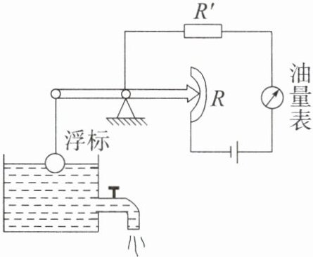 9. 一种自动测定油箱内油面高度的装置如图所示,R是滑动变阻器,滑动变阻器R的金属滑片是杠杆的一端,$R'$是定值电阻。从油量表指针所指的刻度,就可以知道油箱内油面的高度。