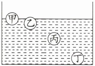 7. 甲、乙、丙、丁是四个体积、形状相同而材质不同的小球,把它们放入水中静止后的情况如图所示,则它们在水中所受浮力相等的是 ()